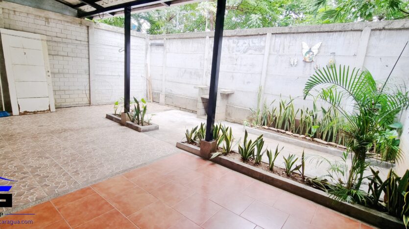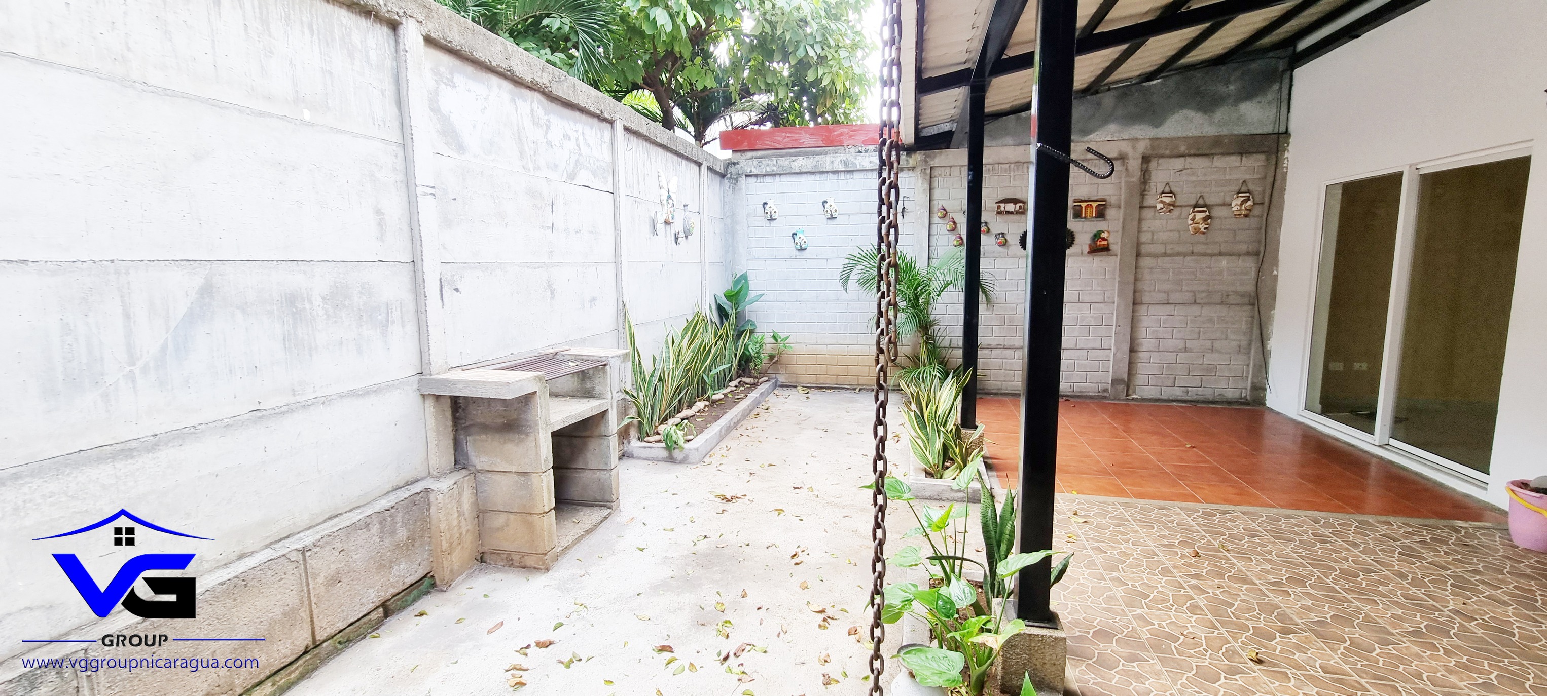 Terraza techada con área de asado y pequeño patio, ideal para reuniones familiares.